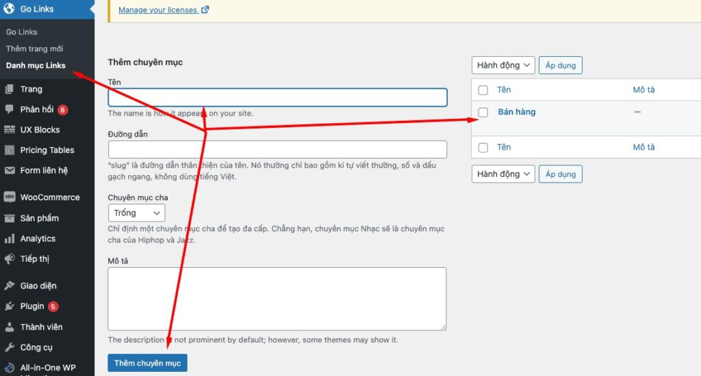 Thêm Danh mục giống bài viết, hoặc sản phẩm. Phần Thêm trang mới chính là trang bọc link để ngụy trang fake cho link chuyển hướng đích.